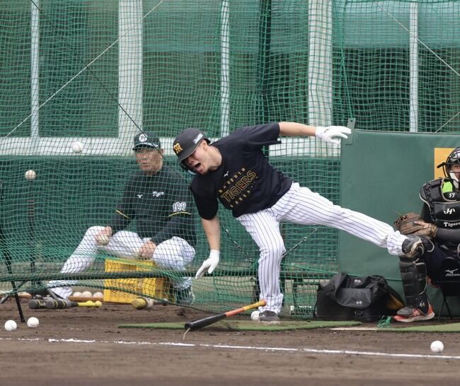 【悲報】昨季の死球0の佐藤輝明さん、打撃練習中に直接膝に死球をくらう